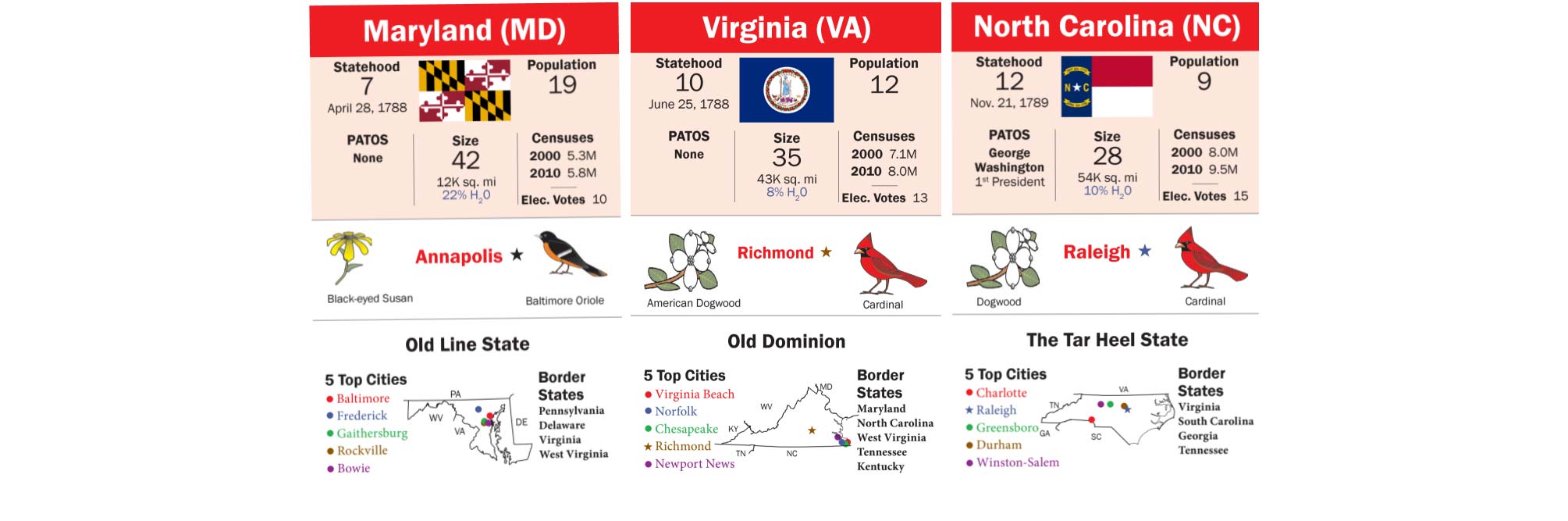 GeoPlunge Card Clarifications: On each GeoPlunge card, the acronym “PATOS” means the “President At Time Of Statehood” for that state. In addition, the color-coded border at the top of each GeoPlunge card indicates the time zone for that state. Where a state is in more than one time zone, the second time zone is represented by a circle in the appropriate color on the top right corner of the card.