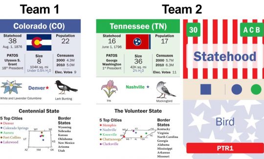 Determining Who Guesses First: Each team picks a GeoPlunge card without looking at that card in advance. Whichever team’s card has a statehood ranking closer to 1 will be the first guessing team in this game.